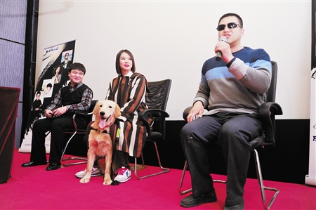 图② 女主角黄璐(中)携导盲犬专程从外地赶来,盲人演员穆怀鹏(右)、王志华(左)在观众见面会上分享电影幕后故事。 本报记者 王 津摄